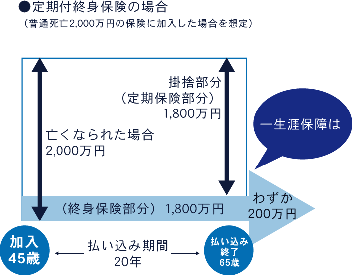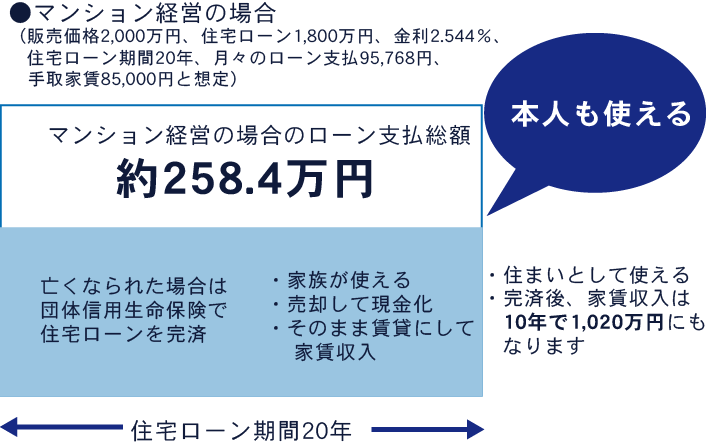 『不動産経営』は、安定した収入源確保とともに、ご家族への保障にもなるわけです。 ※ 団体信用生命保険:住宅口一ン返済途中で死亡・高度障害になつた場合に、本人に代わって生命保険会社が住宅口一ンの残債を支払う制度です。 物件価格と同額の保険に加入する場合とを比較してもたいへん有利です。 また、一般的な生命保険(定期保険特約付終身保険)ではなんと65歳以降になると、死亡保険金は100万円のみで、配当積立金が少々つくだけです。